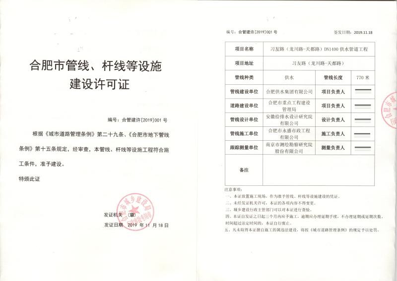 2019年11月18日,隨著合肥市工程建設項目網上審批流程的完成,首張《合肥市管線、桿線等設施建設許可證》正式核發,標志著合肥市地下管線建設從此邁入規范、科學、有序建設的新時期。…