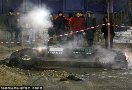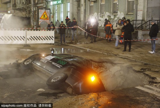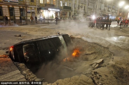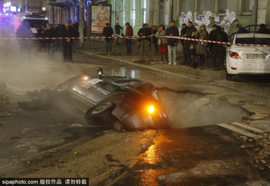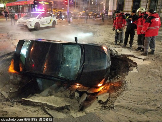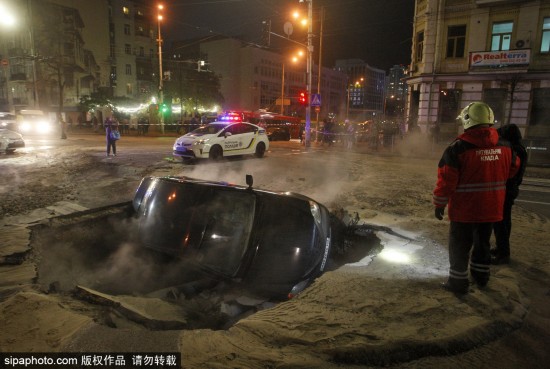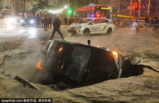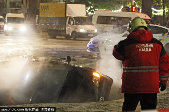 當(dāng)?shù)貢r(shí)間2018年11月13日,烏克蘭基輔,一輛車掉進(jìn)了地面塌陷所造的深溝里。該事故發(fā)生在烏克蘭基輔市中心路段,供暖水管破裂導(dǎo)致路面出現(xiàn)塌陷情況,從而使得交通更加擁擠,對(duì)出行造成了很大的影響。(圖源:希帕中國(guó))