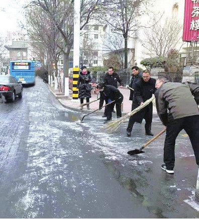 “由于污水外溢或自來水外溢、市政施工等原因造成路面積冰現象,懇請各產權單位、責任單位及時維修維護,并負責清理現場。環衛局也會按照屬地管理原則進行輔助性清理,保障路面整潔和行人車輛暢行。”環衛執法中隊分隊長崔鵬介紹到。