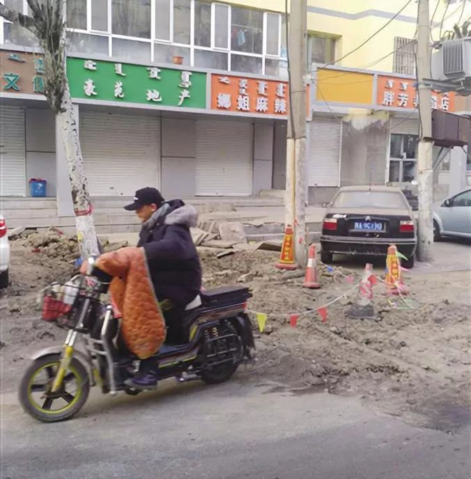 記者在貝爾路西段水文隊宿舍小區門口看到,原本不寬的道路有一半的路面被挖開,如今進行了簡單的回填,回填的路面并不平整,還堆積了不少泥土塊,上面擺放了幾個錐桶用來做警示。道路的一側施劃了停車位,破開的道路僅留下兩米多寬的完好路面可以通行,導致機動車、非機動車和行人在完好的路段搶行。
