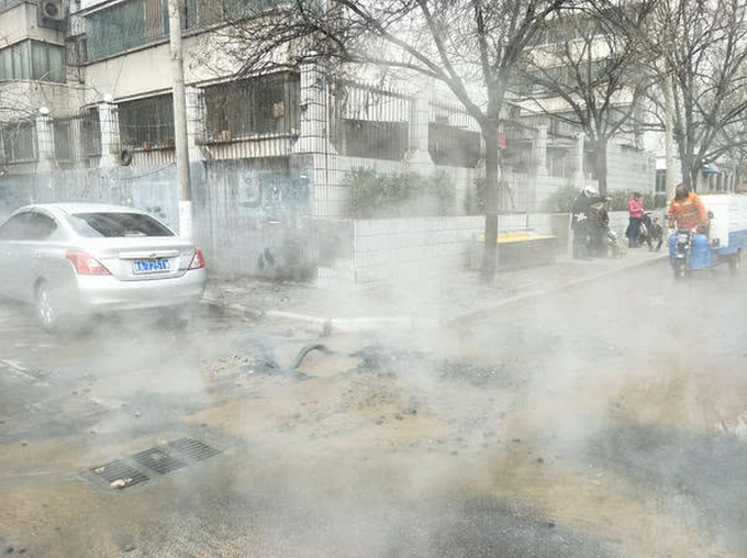 1月28日上午11時20分左右,金水區(qū)文化路街道辦事處巡防隊員呂春成、秦蘇榮等人,巡邏到文博東路6號院附近時,發(fā)現(xiàn)前方霧氣騰騰,大股冒著熱氣的水流從地下噴出,沖刷在一輛停在路邊的轎車上。幾分鐘后,整個路面熱水橫流,散發(fā)出的水蒸汽讓街道變得云霧繚繞,讓走對面的人都難以看清對方的面容。