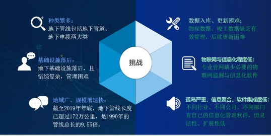 管網的規劃、建設、運維管理、改造優化等面臨著眾多挑戰。一方面,城市地下的管線種類繁多,供水、排水、燃氣、熱力等8大類20余種管線錯綜復雜,環環相扣。