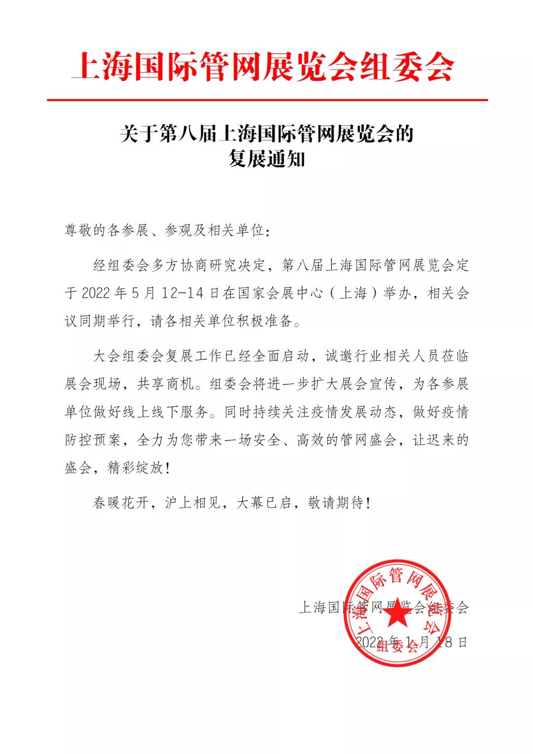 第八屆中國國際管網展將于2022年5月12日-14日舉辦,展示面積預計超過50000平米,將吸引展商600余家,專業觀眾預計超60000多人次。大會同期召開上海國際非開挖工程裝備展覽會,同時將開展150余場高峰論壇、行業研討和新品發布會議,大會覆蓋管網建設、管網運行、智慧水務、燃氣熱力、污水污泥處理、管道材料、地下空間、在線運行監測、管網探測檢測、非開挖修復、微型非開挖掘進設備、新型市政機械設備等多個領域。誠摯的邀請行業單位繼續參加本次大會,通過展覽和論壇全面展示公司業務,交流行業心得,共同建立政、產、學、研一站式管網技術交流平臺。