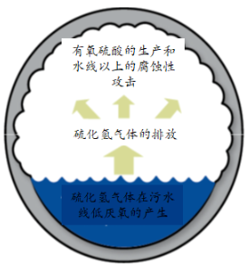 在污水液面以下,水泥受到污水中的酸和堿、以及有機物在厭氧條件下分解產生的有機酸等酸性物質的腐蝕。