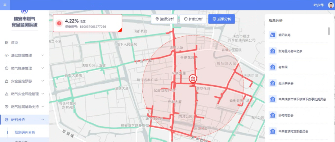 系統結合泄漏點位和氣體算法模型,可對溯源、擴展分析和爆炸后果進行可視化推演,形成全市管網隱患“一張圖”。建立“一般、中等、嚴重”三級預警機制,分類設置應急處置預案,精準向燃氣公司推送問題隱患位置、可燃氣體實時濃度值、變化曲線、危險級別等信息,確保高效動態干預。