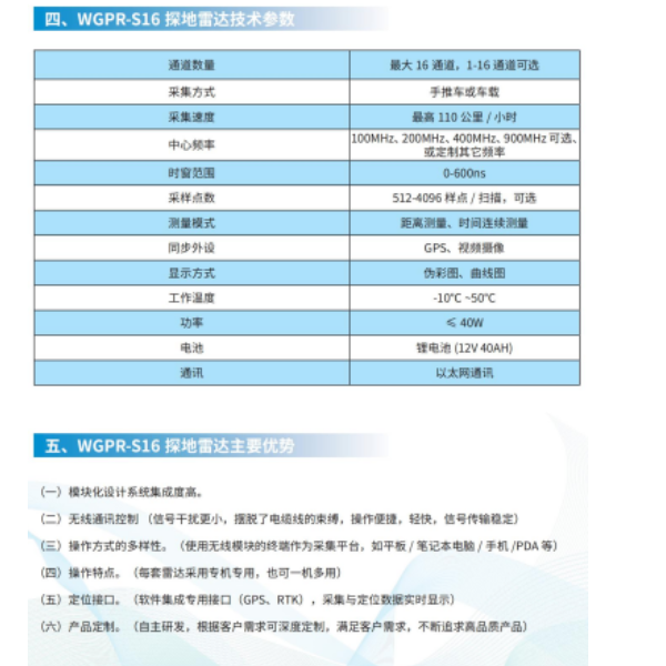 多通道三維雷達:WGPR-S16組網式16通道探地雷達是基于寬頻帶窄脈沖電磁波技術的陣列式雷達系統,組網式主機天線掛接,最大16通道,1-16通道可選,可車載亦可人工推動,最高時速110公里/小時,同步頻視,GPS,車轍,地形坡度等各類參數。