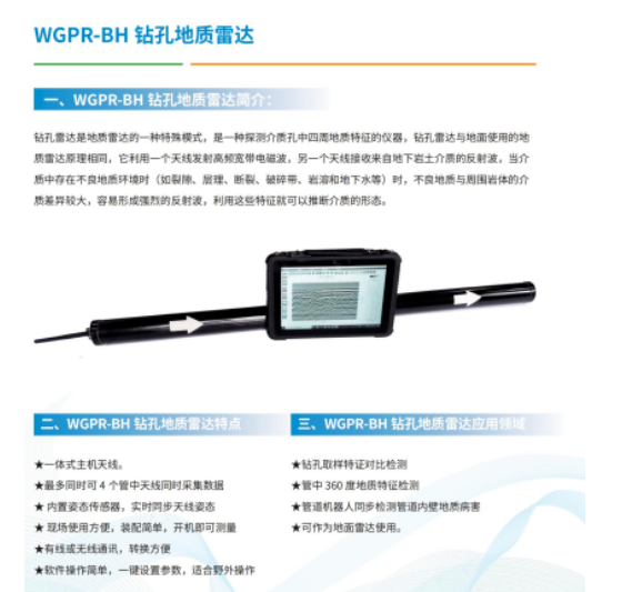 鉆孔雷達:鉆孔雷達是地質雷達的一種特殊模式,當介質中存在不良地質地質環境時(如裂隙、層理、斷裂、破碎帶、巖溶和地下水等)時,不良地質與周圍巖體的介質差異較大,容易形成強烈的反射波,利用這些特征就可以推斷介質的形態。
