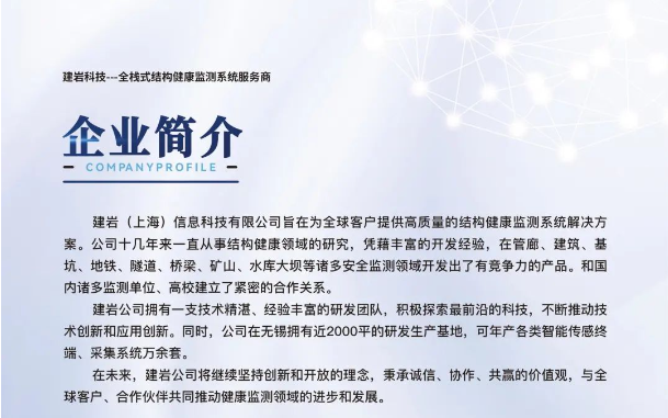 建巖(上海)信息科技有限公司,成立于2014年,十余年來只縱深于結構變形領域,為國家級高新技術企業。在無錫設有生產基地,現有自主研發產品20余項,硬件方面有沉降物位計;沉降水準儀(有線、無線);傾角儀(有線、無線);三軸測振儀;機器視覺;磁致伸縮靜力水準儀;固定式測斜儀;激光測距儀;表面應變計;錨索計;鋼筋計;軸力計;拉線位移計;拉桿位移計;北斗GNSS;采集傳輸系統(內置邊緣計算算法);軟件平臺為結構云智能監測平臺(V3.0版本)。
