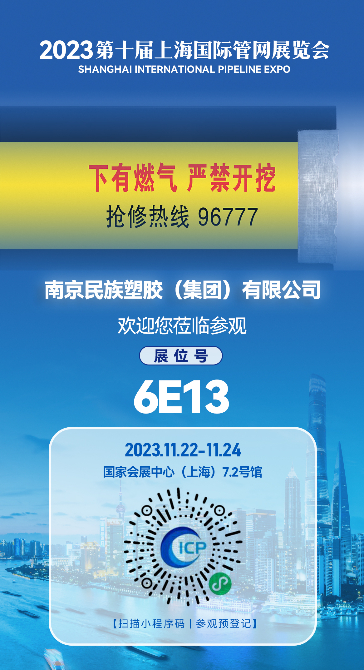 南京民族塑膠(集團)有限公司將于2023年11月22-24日亮相第十屆中國(上海)國際管網展覽會,誠邀您的蒞臨洽談交流!