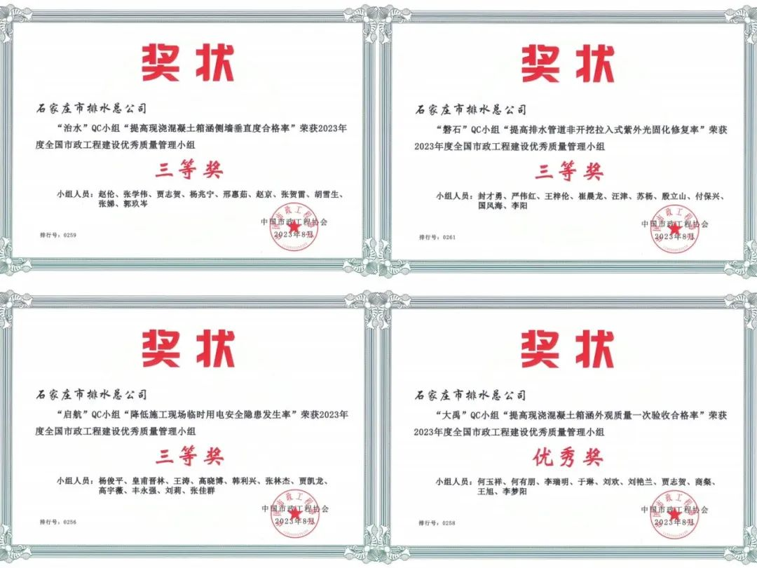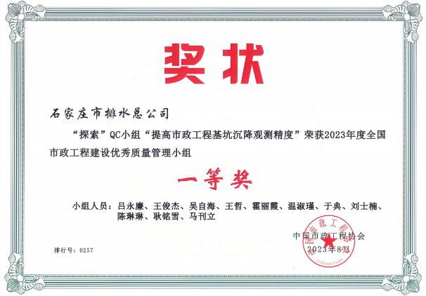 近日,石家莊市排水總公司申報的多項QC成果在2023年度全國市政工程建設質量管理小組活動成果交流會中榮獲獎項,此次交流會由中國市政工程協會舉辦,采用線上交流模式,來自全國不同省、市行業協會分三批共發布成果1492項。其中我公司“探索QC小組”的《提高市政工程基坑沉降觀測精度》成果獲得一等獎,“卓越QC小組”的《提高瀝青路面雨污水井蓋安裝質量》、“超越QC小組”的《提高市政工程文明施工達標率》獲得二等獎,其他三項成果獲得三等獎,一項成果獲得優秀獎。