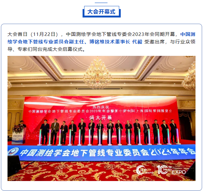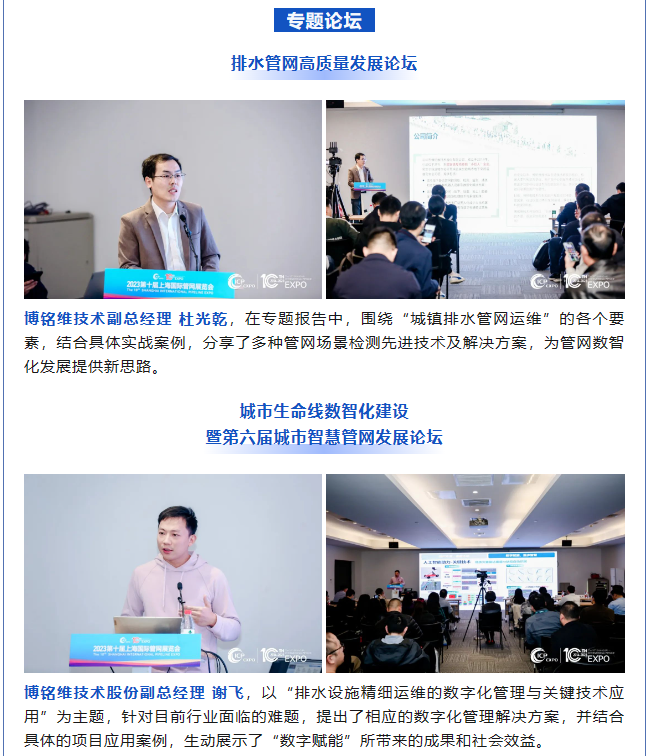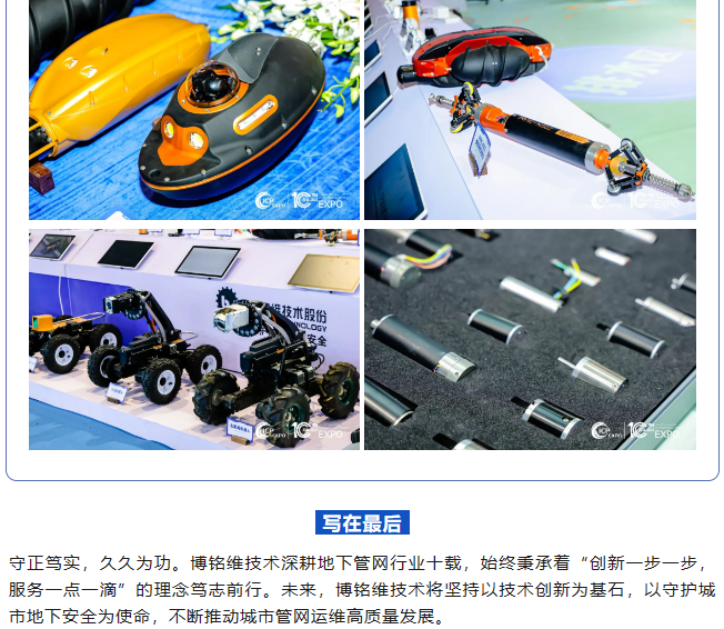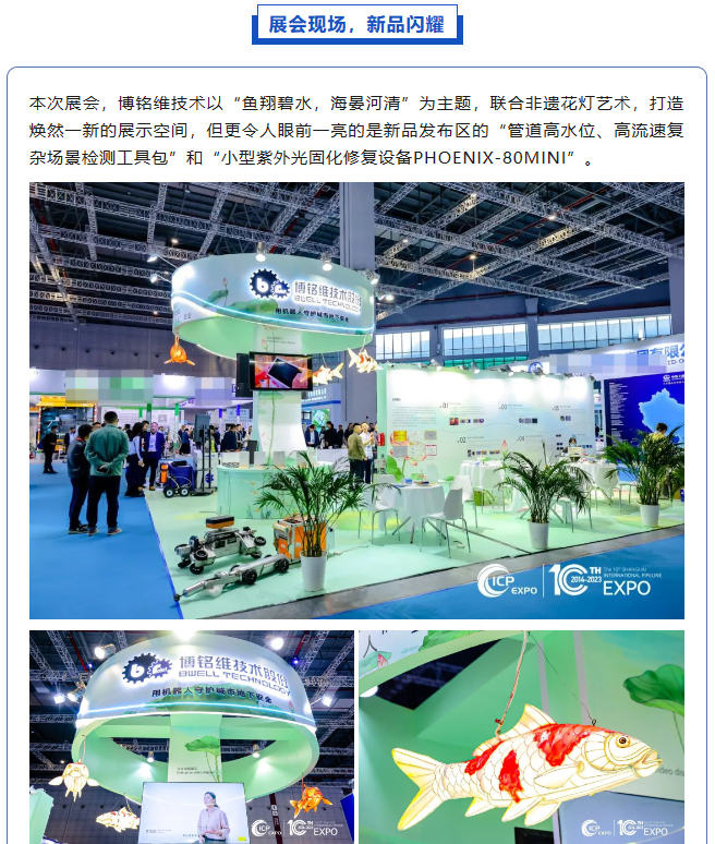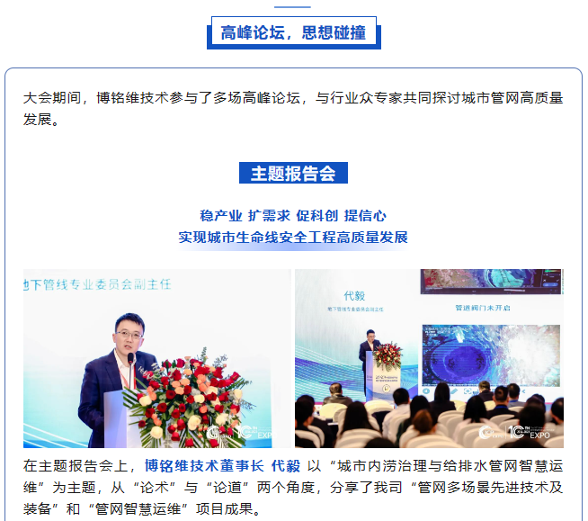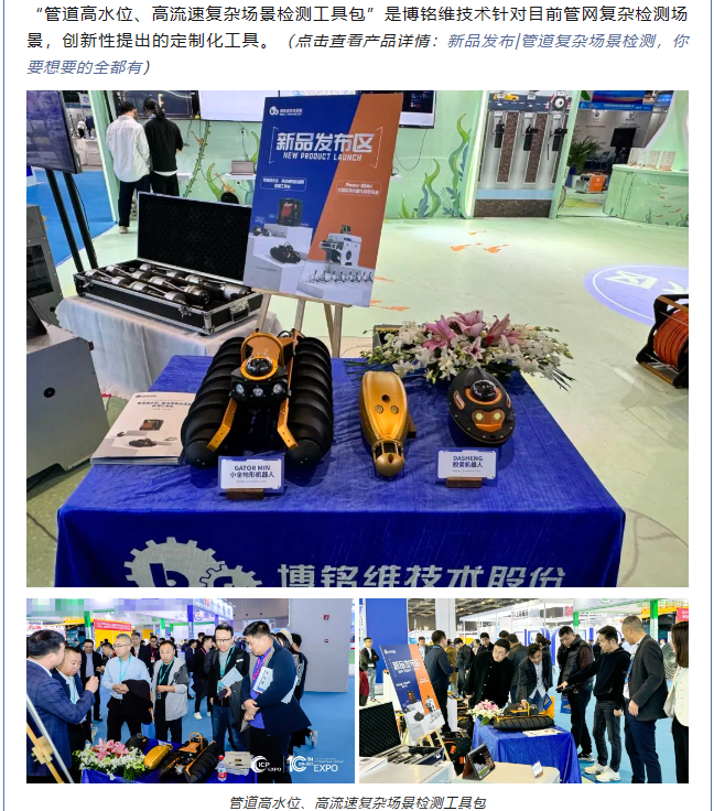 11月22日至24日,2023第十屆中國(上海)國際管網(wǎng)展覽會在國家會展中心(上海)順利舉辦!作為國內(nèi)供排水管網(wǎng)檢測領(lǐng)域引領(lǐng)者,博銘維技術(shù)攜多款新品亮相本次盛會,并在多個論壇做專題報告,全方位展示了我司在城市管網(wǎng)領(lǐng)域的綜合實(shí)力。