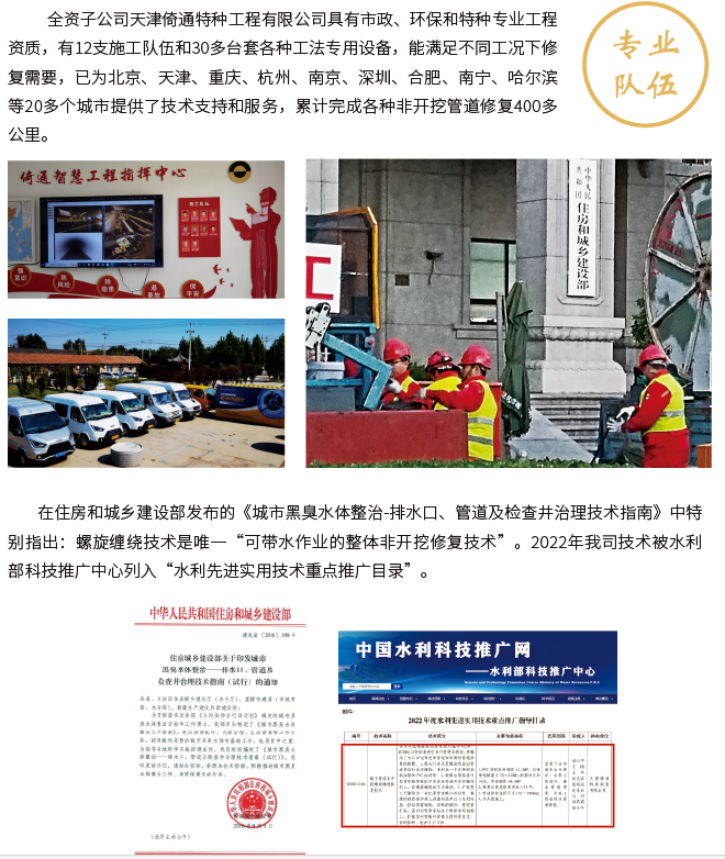 津倚通科技發展有限公司是從事地下給排水管道非開挖技術研究、非開挖智能設備制造、型材生產、管道診斷、解決方案和施工服務于一體的國家級高新技術企業、天津市專精特新企業、天津市瞪羚企業。與中國地質大學、天津科技大學等建立了合作關系,共同在材料優化、設備智能化、工程技術等方面進行深度研究與合作。