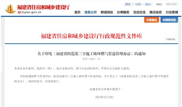 近日,福建省住房和城鄉(xiāng)建設(shè)廳發(fā)布關(guān)于印發(fā)《福建省防范第三方施工破壞燃?xì)夤艿拦芾磙k法》的通知。