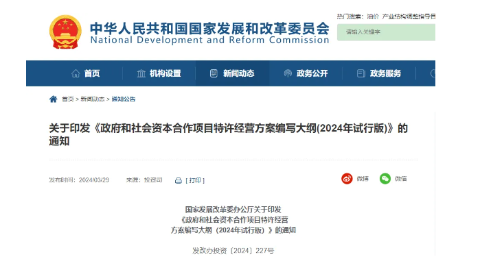 繼2023年11月,《關于規范實施政府和社會資本合作新機制的指導意見》發布后, 發改委于近日,發布《政府和社會資本合作項目特許經營方案編寫大綱(2024年試行版)》(以下簡稱為《編寫大綱》)。