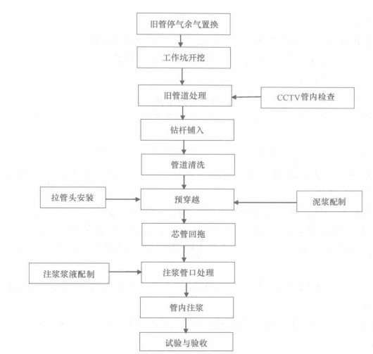施工準備→工作坑開挖→舊管道處理→管道清洗→PE芯管回拖牽引→管內(nèi)注漿→管道試驗。具體的施工流程詳見下圖。