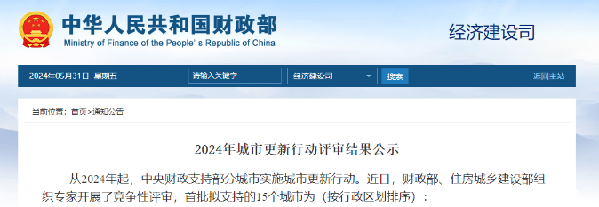 從2024年起,中央財政支持部分城市實施城市更新行動。近日,財政部、住房城鄉建設部組織專家開展了競爭性評審,首批擬支持的15個城市為(按行政區劃排序):