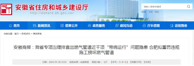 城市燃氣管道安全問題備受市民關注。近日,安徽商報融媒體記者從省住房和城鄉建設廳獲悉,我省全面開展了燃氣管道“帶病運行”問題專項治理,累計排查燃氣管道“帶病運行”問題隱患977項。為了保障燃氣管道“生命線”安全運行,維護城市安全和公共安全,合肥市也將出臺相關辦法,擬對違規施工導致燃氣管道損壞的單位及個人加大處罰力度。
