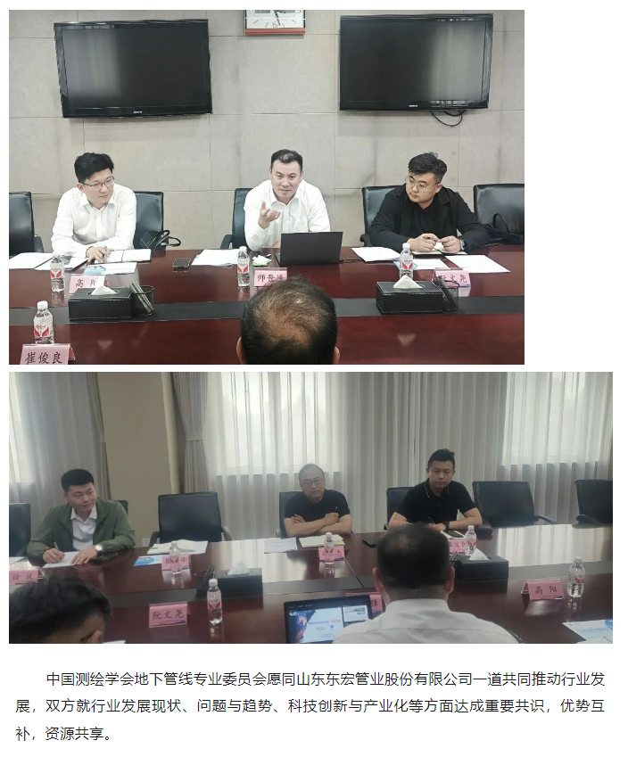 5月9日,山東東宏管業股份有限公司副總經理、城市生命線產業發展(曲阜)有限公司董事長師晉鋒、城市生命線產業發展(曲阜)有限公司副總經理阮文堯、山東東宏管業股份有限公司北京區域銷售經理高陽一行來到中國測繪學會地下管線專業委員會(以下簡稱“地下管線專業委員會”)進行交流探討,地下管線專業委員會常務副秘書長劉會忠,外聯部主任崔俊良,會展部副主任崔希舜和徐斌出席參加交流座談。