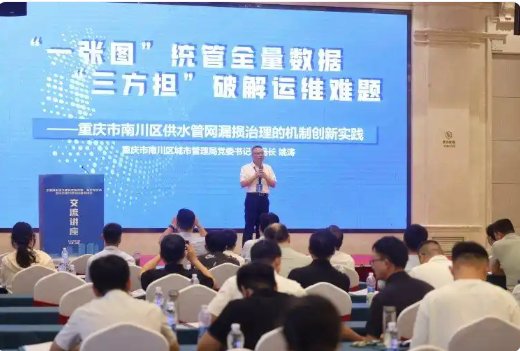 值得關注的是,重慶市南川區城市管理局黨委書記、局長姚濤應邀在會上分享南川區公共供水管網漏損治理經驗。姚濤以“一張圖統管全量數據,三方擔破解運維難題”為主題,詳細闡述了南川區在公共供水管網漏損治理方面的機制創新。以破冰、破局、破浪為主線,圍繞數據筑基、機制破題等核心要點,為大家全面匯報了南川區在山地城市供水管網漏損治理復雜環境中的探索與實踐。