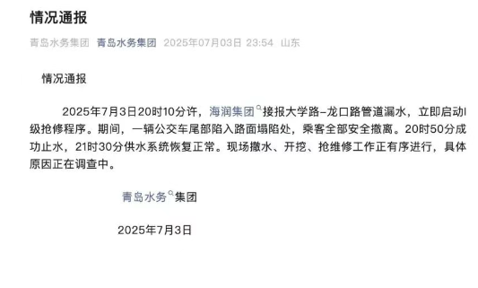 3日深夜,青島水務(wù)集團官方微信發(fā)布通報稱,3日20時10分許,海潤集團接報大學(xué)路-龍口路管道漏水,立即啟動I級搶修程序。其間,一輛公交車尾部陷入路面塌陷處,乘客全部安全撤離。20時50分成功止水,21時30分供水系統(tǒng)恢復(fù)正常。現(xiàn)場撤水、開挖、搶維修工作正有序進行,具體原因正在調(diào)查中。